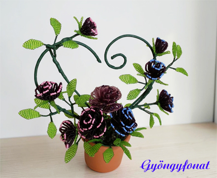 A virágokat 2 mm-es sötét lila gyöngyből készítettem, kék és rózsaszín