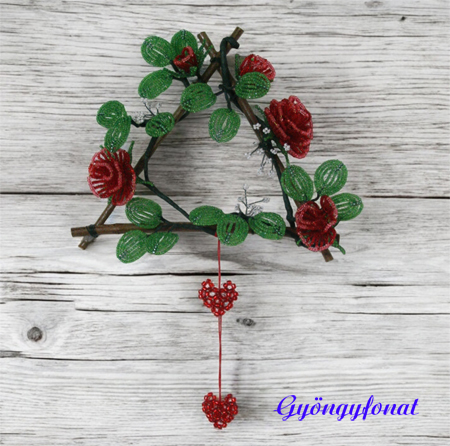 A díszen lévő virágokat 2 mm-es rózsaszín és zöld kásagyöngyből fűztem.